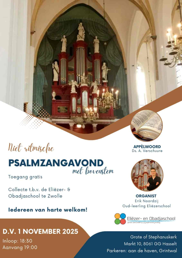 Tijdstip: 19.00 Locatie: Grote Kerk, Markt 10, Hasselt   Niet ritmische psalmzang met bovenstemKerk open: 18.30 uurToegang gratis Collecte bestemd voor de Eliëzer & Obadjaschool Zwolle Medewerkenden