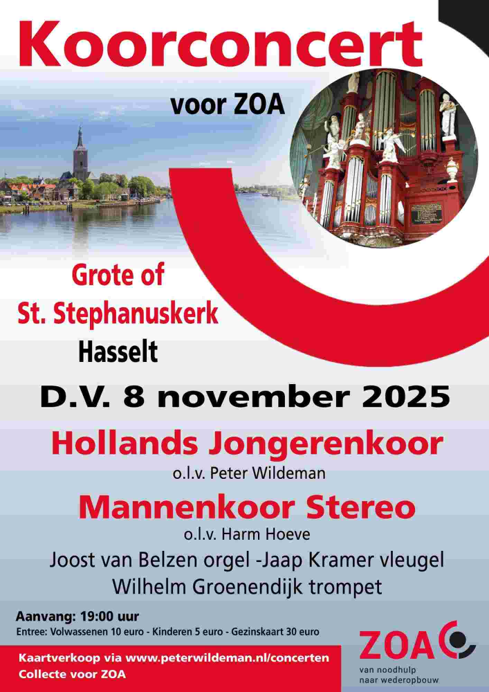 Koorconcert Hollands Jongerenkoor en Mannenkoor StereoKerk open: 18.30 uurEntree: € 10.00 volwassenen, € 5.00 kinderen, € 30.00 gezinskaart Tickets bestellen: Klik hier Collecte bestemd voor ZOA Medewerkenden