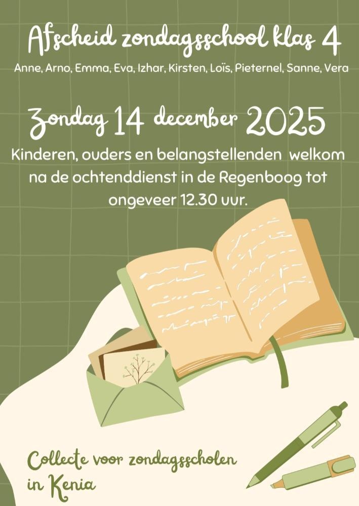 Afscheid zondagschool klas 4Kinderen, ouders en belangstellenden welkom na de ochtenddienst.Collecte bestemd voor zondagscholen in Kenia. | ||