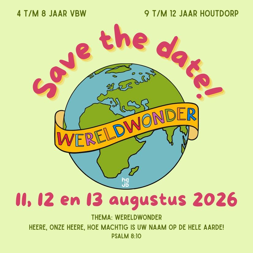 Het thema is dit jaar 'Wereldwonder'. We hopen samen met de kinderen na te denken over de schepping & diverse bijbelverhalen waarin wonderen gebeuren.