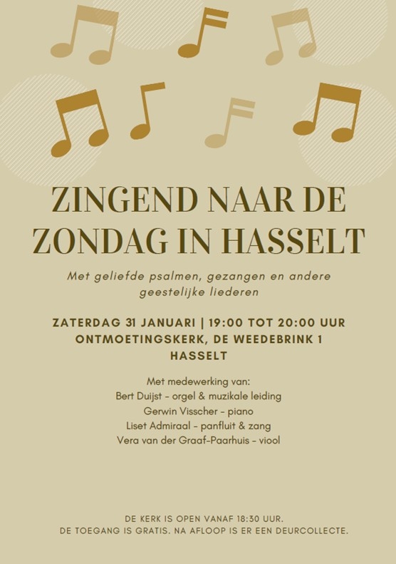 Plaats: Ontmoetingkerk, Weedebrink 1, Hasselt.